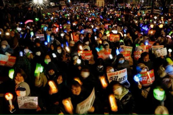 Ribuan orang berunjuk rasa di depan parlemen di Seoul pada Minggu, menyerukan pemakzulan dan penangkapan Yoon serta pembubaran partai yang berkuasa.