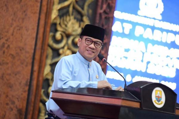 Mendes PDT Yandri Susanto memberi sambutan dalam Rapat Paripurna DPRD Provinsi Jambi dalam Rangka Memperingati Hari Ulang Tahun (HUT) Ke-68 Provinsi Jambi (Foto: Kemendes PDT)