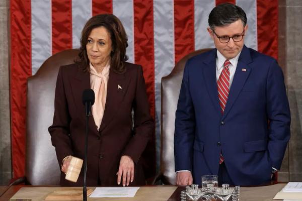 Wakil Presiden Kamala Harris dan Ketua DPR Mike Johnson menghadiri sesi gabungan Kongres untuk mengesahkan pemilihan Donald Trump, di Gedung DPR AS di Washington, AS, 6 Januari 2025. REUTERS