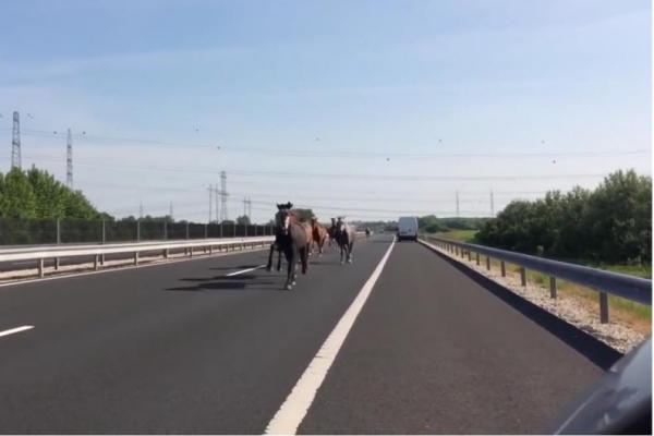 Paks - Sekelompok kuda berlarian di tengah jalan raya M16 di wilayah Paks Hungaria membuat para pengguna jalan terkejut.