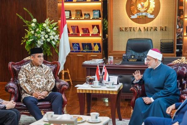 Jakarta, jurnas.news - Ketua MPR RI Ahmad Muzani menerima kunjungan Rektor Universitas Al Azhar Kairo, Mesir, Prof Dr Salamah Daud di kantor MPR RI, Senayan, Jakarta, Rabu (19/2/2025). Ketua MPR menyampaikan terima kasih atas kunjungannya ke rumah kebangsaan ini.