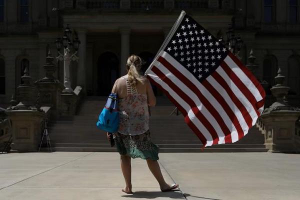 Seorang wanita berdiri dengan bendera Amerika di Lansing, Michigan, AS, 15 Juni 2022. REUTERS