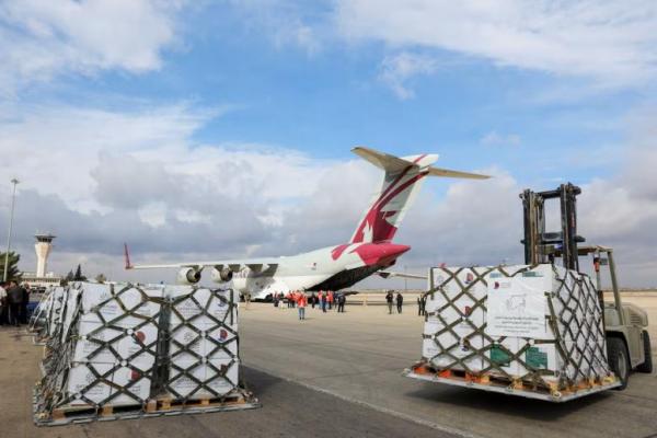 Orang-orang berdiri di dekat pesawat yang membawa bantuan dari Qatar, saat tiba di Bandara Internasional Damaskus, Suriah, 30 Desember 2024. REUTERS