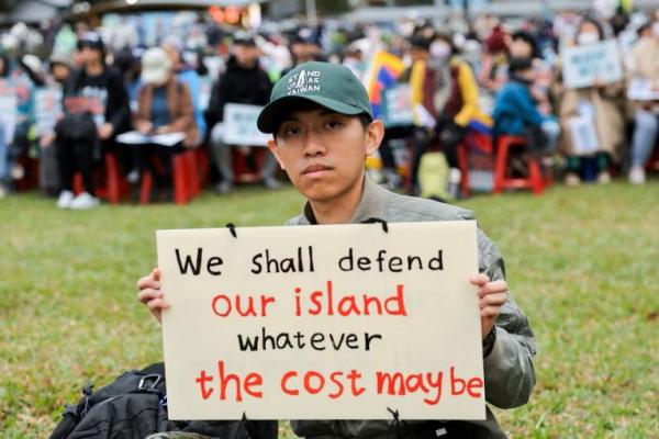 Seorang pria berpose dengan plakatnya sendiri di rapat umum di Taipei, Taiwan 8 Desember 2024 REUTERS