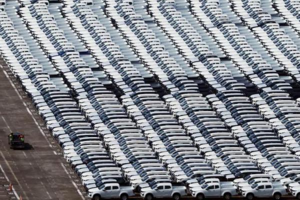 Mobil yang diturunkan dari kapal kargo diparkir di terminal peti kemas Tanjong Pagar di Singapura, 3 April 2025. REUTERS