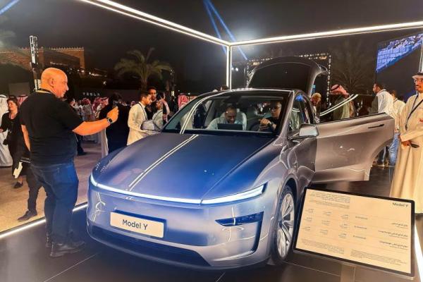 Seorang tamu mengambil foto Tesla Model Y, yang dipajang selama upacara peresmian ruang pamer Tesla pertama di Riyadh, Arab Saudi. 10 April 2025. REUTERS