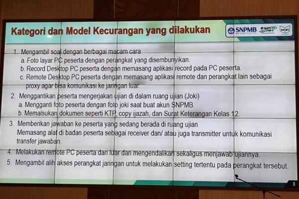 Hal ini disampaikan menyusul maraknya kecurangan UTBK hingga sesi ke-12. Dari temuan panitia SNPMB, kecurangan dilakukan dengan berbagai model dan bentuk yang lebih canggih dari tahun-tahun sebelumnya.