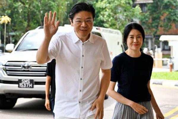 Perdana Menteri Singapura Lawrence Wong melambaikan tangan saat ke tempat pemungutan suara bersama istrinya Loo Tze Lui, di Singapura 3 Mei 2025. REUTERS