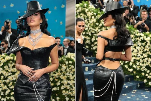 Selama malam mode terbesar, yang bertemakan "Superfine: Tailoring Black Style," Kim Kardashian mengenakan set korset Chrome Hearts yang menampilkan tampilan berani yang memeluk bokong.