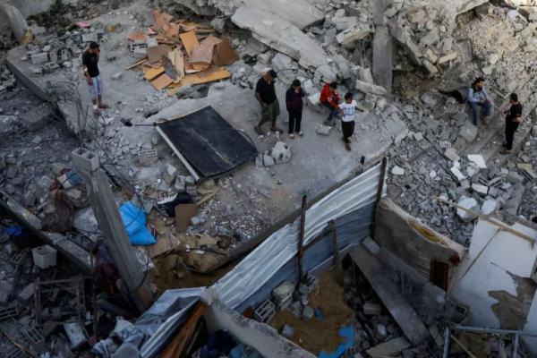 Warga Palestina memeriksa lokasi serangan Israel terhadap sebuah rumah, di Khan Younis di Jalur Gaza selatan, 3 Mei 2025. REUTERS