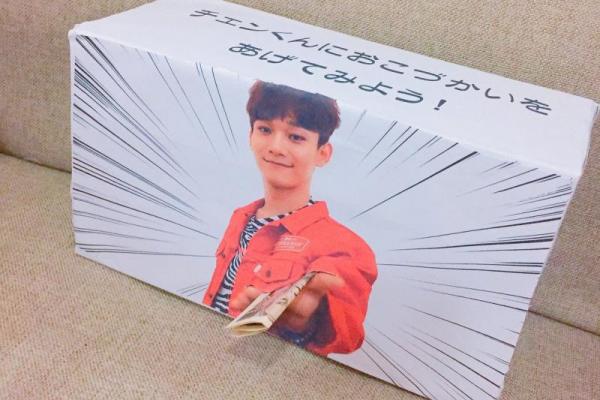 Fans boyband asal Korea Selatan itu membuat celah kecil tepat di tangan Chen, diatas kotak itu dia juga menulis, "mari beri Chen uang saku!"