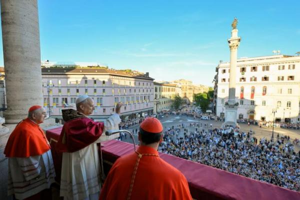 Paus Leo XIV melambaikan tangan kepada umat beriman dari balkon Basilika Santa Maria Maggiore di Roma, Italia, 25 Mei 2025. Handout via REUTERS