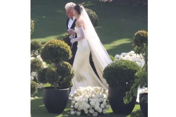 Aktris Hailee Steinfeld difoto berjalan menuju lorong untuk menikahi quarterback Buffalo Bills (29) di pernikahan mewah mereka di California pada hari Sabtu (31/5/2025).