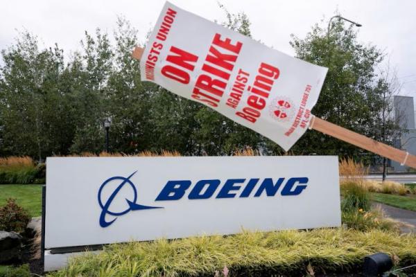 Tanda pemogokan tergantung di tiang dekat tanda Boeing saat pemogokan pekerja masuki hari ketiga di Renton, Washington, AS, 15 September 2024. REUTERS