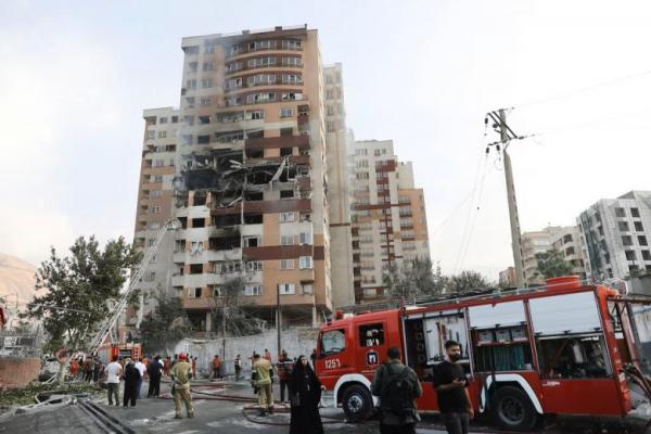 Petugas pemadam kebakaran bekerja di lokasi bangunan yang rusak setelah serangan Israel, di Teheran, Iran, 13 Juni 2025. WANA via REUTERS