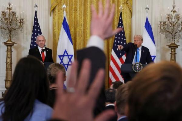 Presiden AS Donald Trump dan Perdana Menteri Israel Benjamin Netanyahu saat konferensi pers bersama di Ruang Timur Gedung Putih di Washington, AS, 4 Februari 2025. REUTERS