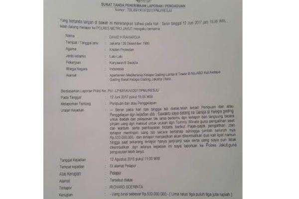 Salah satu jemaat David Rahardja mengatakan, Pendeta Richard dilaporkan atas dugaan penipuan dan penggelapan. Menurutnya, ketika hendak pelayanan di Gereja, Pendeta Richard menyampaikan untuk meminjam uang untuk keperluan pengalihan aset dan warisan serta pembayaran notaris berikut pajak-pajak pengalihan."Richard meminjam uang itu secara bertahap sehingga jumlah seluruhnya Rp 533.000.000 dan menjanjikan akan mengembalikan dua kali lipat. Namun hingga saat ini hanya janji-janji saja, uang saya pun tidak dikembalikan," kata David, kepada wartawan, Jakarta, Jumat (16/6).Atas dasar itu, David melaporkan Pendeta Richard Soerinta ke Polres Jakarta Utara dengan tuduhan penipuan dan penggelapan. Ada pun surat laporan polisi Nomor: TBL/691/K/VI/2017/PMJ/RESJU.