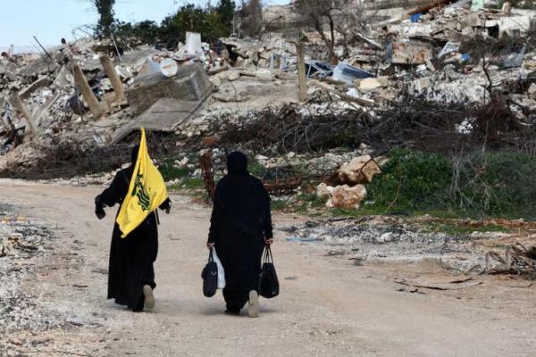 Wanita berjalan di dekat bangunan yang hancur, dengan satu orang memegang bendera Hizbullah, di desa Kfar Kila di Lebanon selatan, 18 Februari 2025. REUTERS