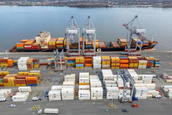 Pemandangan drone menunjukkan kontainer pengiriman di Pelabuhan Montreal di Montreal, Quebec, Kanada, 14 April 2025. REUTERS