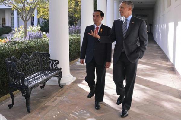 Presiden Joko Widodo berjalan di Istana Bogor saat kunjungan Barack Obama menjadi Presiden Amerika Serikat