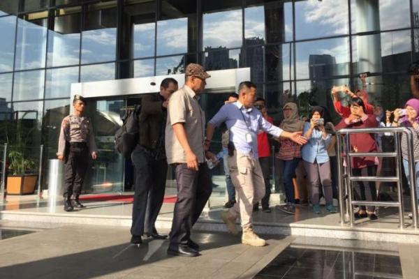Seorang tersangka berpeci coklat dari perusahaan pada kasus suap proyek pelabuhan Tanjung Mas setelah ditangkap tangan KPK