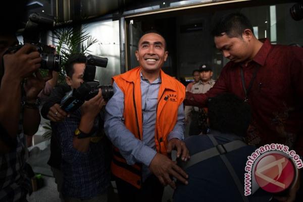 Bupati nonaktif Buton Samsu Umar Abdul Samiun (tengah) meninggalkan Gedung KPK usai diperiksa.