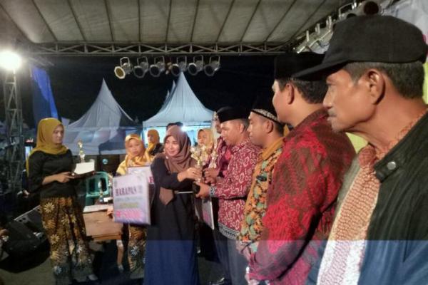 Jaswar (berjilbab), tengah memberikan hadiah kepada Kades di Kabupaten Lhoksumawe.