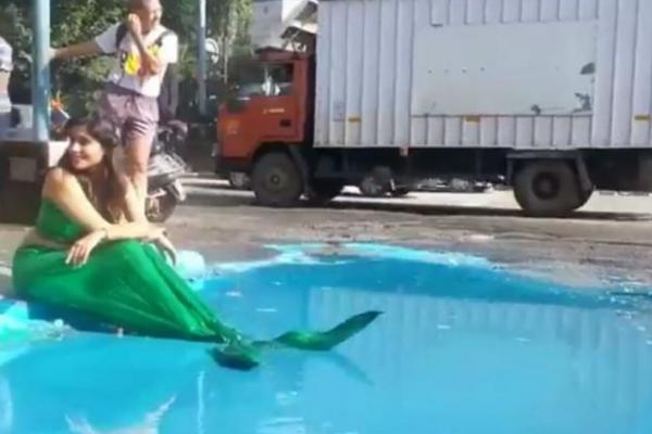Jakarta - Masyarakat di sebuah kota kecil di India terkejut menyaksikan seorang wanita yang begitu cantik berada di pinggir jalan. Perempuan tersebut sedang duduk layaknya seekor ikan lengkap dengan suasana menyerupai air laut yang berwarna biru.
