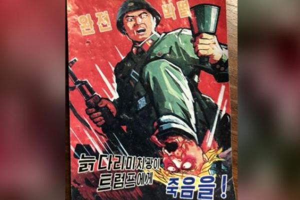 "Kematian Trump tua gila!" terbaca pada satu poster, dengan seorang tentara Korea Utara lengkap dengan senapan di tangannya, menginjak kepala Trump hingga lidahnya terjuntai dari mulutnya.