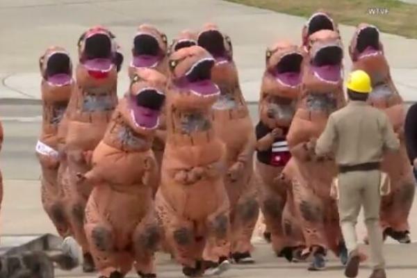 Orang-orang tersebut mengenakan kostum Tyrannosaurus Rex untuk berkumpul di Nashville dan berlari melintasi Jembatan Pedestrian John Seigenthaler sampai ke Broadway.