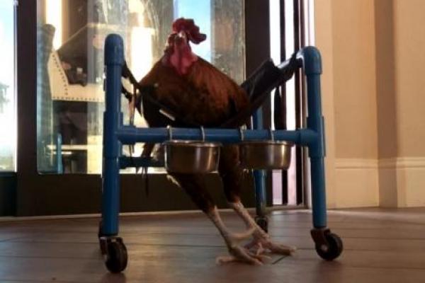 Jakarta - Seekor ayam asal California yang terluka parah dalam perkelahian dengan ayam jantan lain sedang belajar berjalan lagi dengan kursi roda khusus.