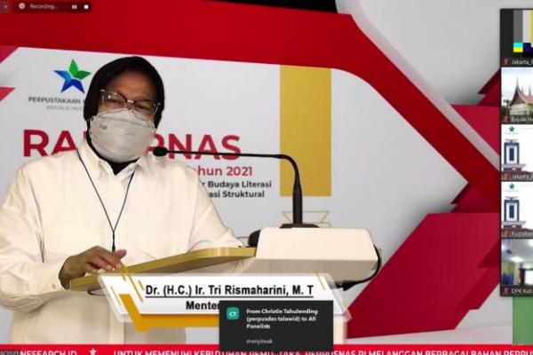 Menteri sosial, Tri Rismaharani pada kegiatan Rakornas Bidang Perpustakaan 2021 yang digelar secara virtual, pada Senin, (22/03).