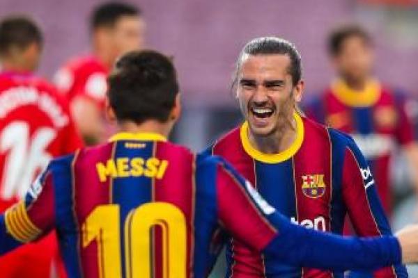 Selebrasi Lionel Messi bersama Griezmann usai menjebol gawang Granada (foto: fansbarca)