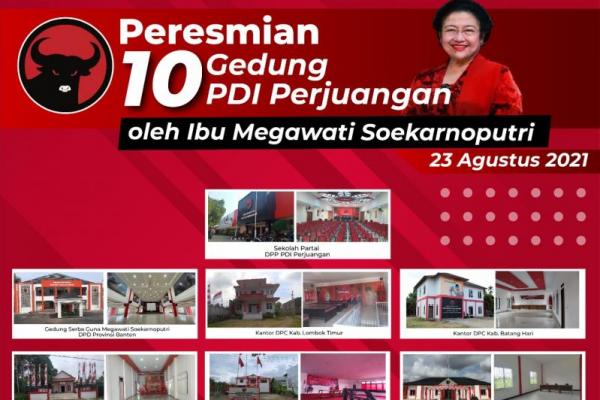 Sekolah Partai PDI Perjuangan, Gedung Serbaguna Megawati Soekarnoputri Provinsi Banten, DPC Kab. Lombok Timur/ Nusa Tenggara Barat, DPC Kab. Batanghari/Jambi, DPC Kubu Raya/ Kalimantan Barat, DPC Kab. Ketapang/ Kalimantan Barat, DPC Kab. Landak/ Kalimantan Barat, DPC Kab. Mempawah/ Kalimantan Barat, DPC Kota Surabaya/ Jawa Timur dan DPC Kab. Aceh Barat- Aceh.